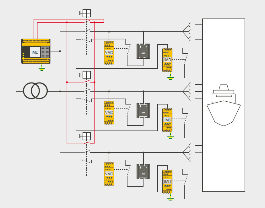 Navele maritime moderne sunt alimentate de cel putin 4 generatoare diesel mari care sunt operate intr-un sistem cu nulul izolat (sistem IT).