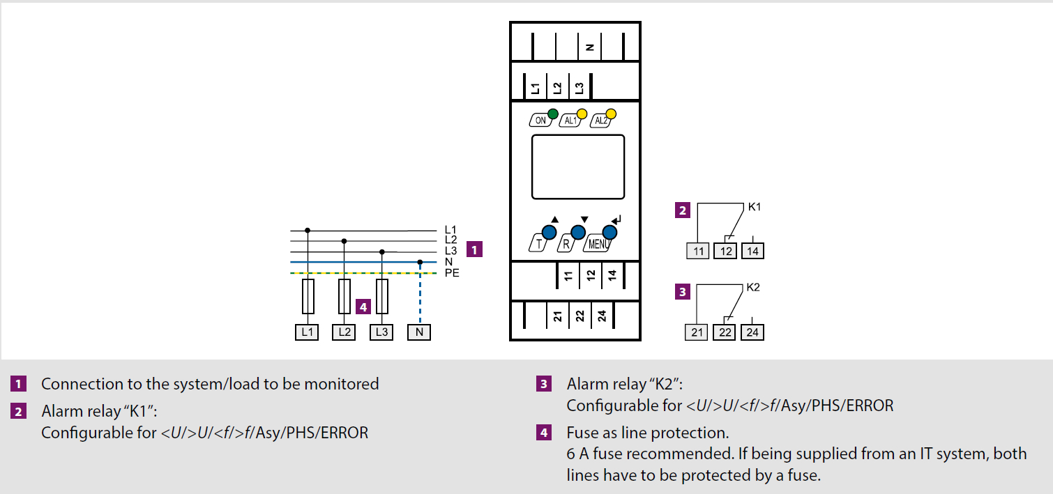 Releele pentru monitorizare tensiune din seria VMD421 sunt relee multifunctionale ce monitorizeaza frecventa, tensiunea minima, tensiunea maxima si tensiunea intre doua praguri (functie discriminator fereastra) in sisteme 3(N)c.a.. Tensiunile sunt masurate ca valori r.m.s.
